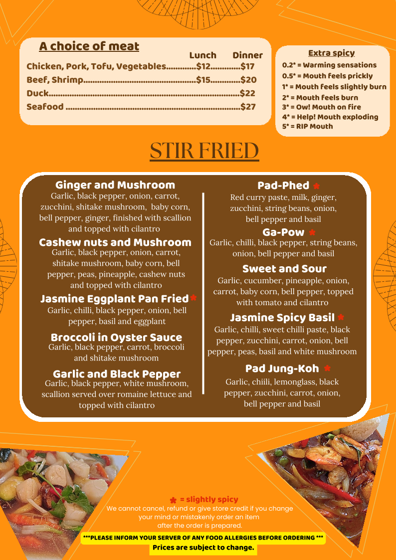 Seafood combination, crispy salmon, garlic, chilli, sweet chilli paste, black pepper, zucchini, carrot, onion, peas, bell pepper, mushroom, basil and glass noodle and served with Jasmine Rice