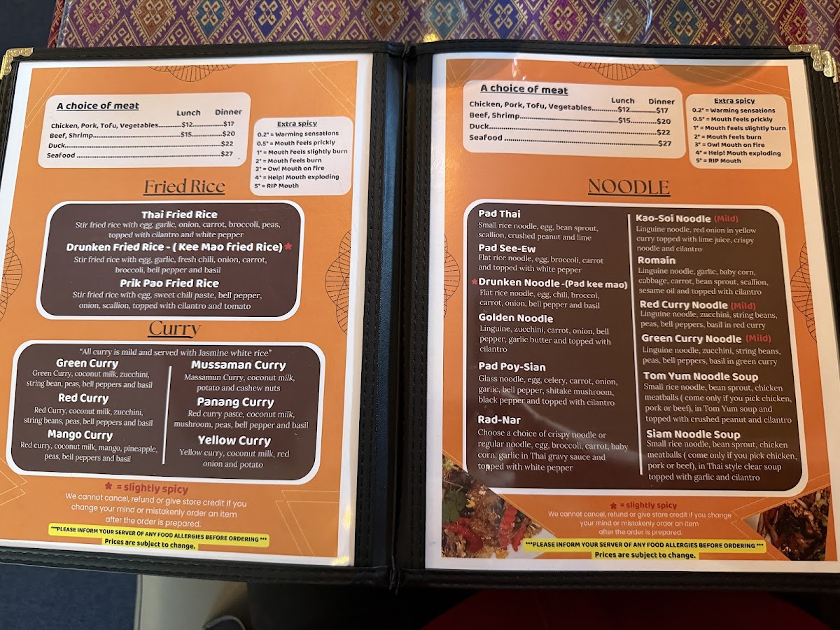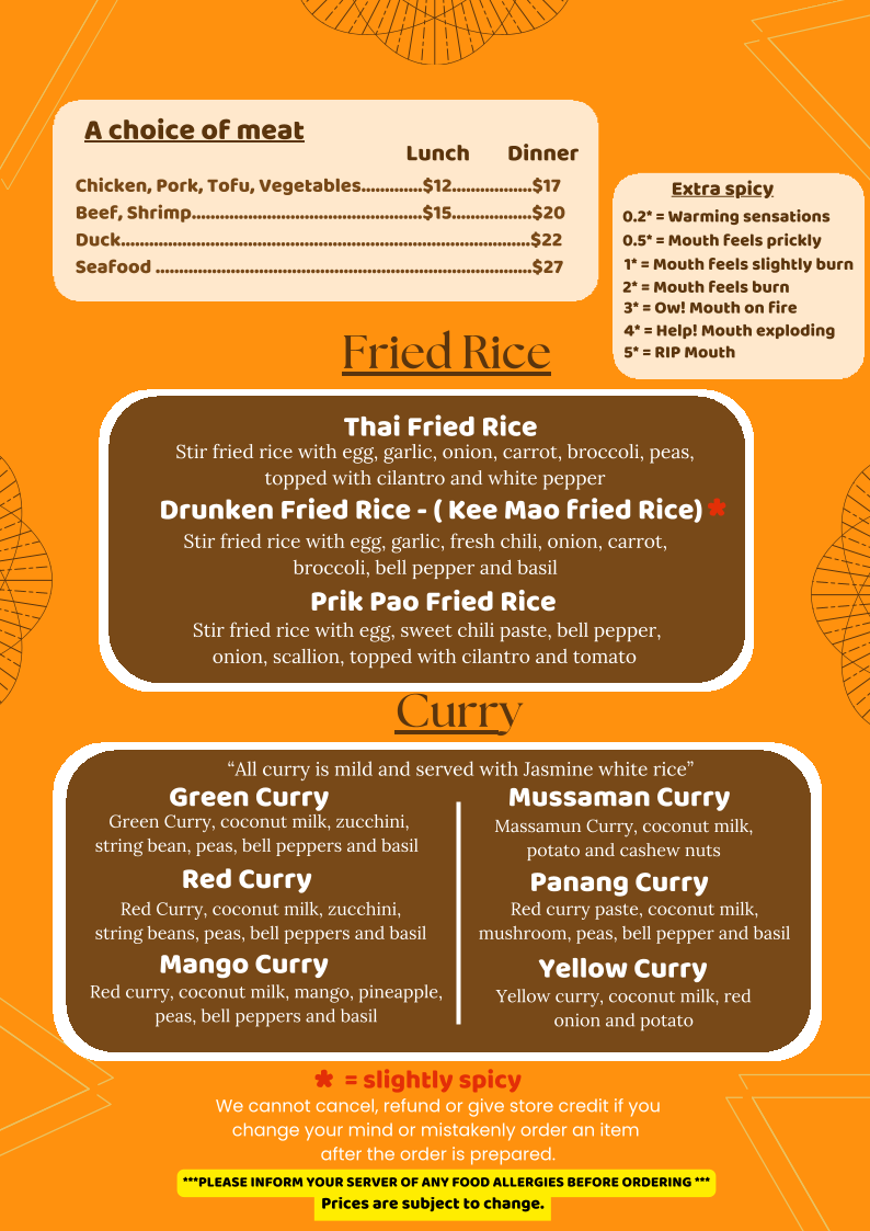 Fried rice with (a choice of chicken, pork, tofu or vegetables),(shrimp or beef +5), egg, pineapple, cashew nuts, onion, yellow curry powder topped with crispy onion, tomato and cilantro