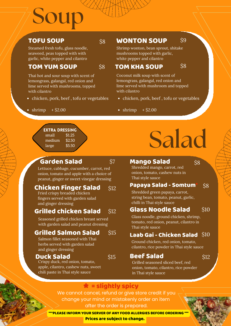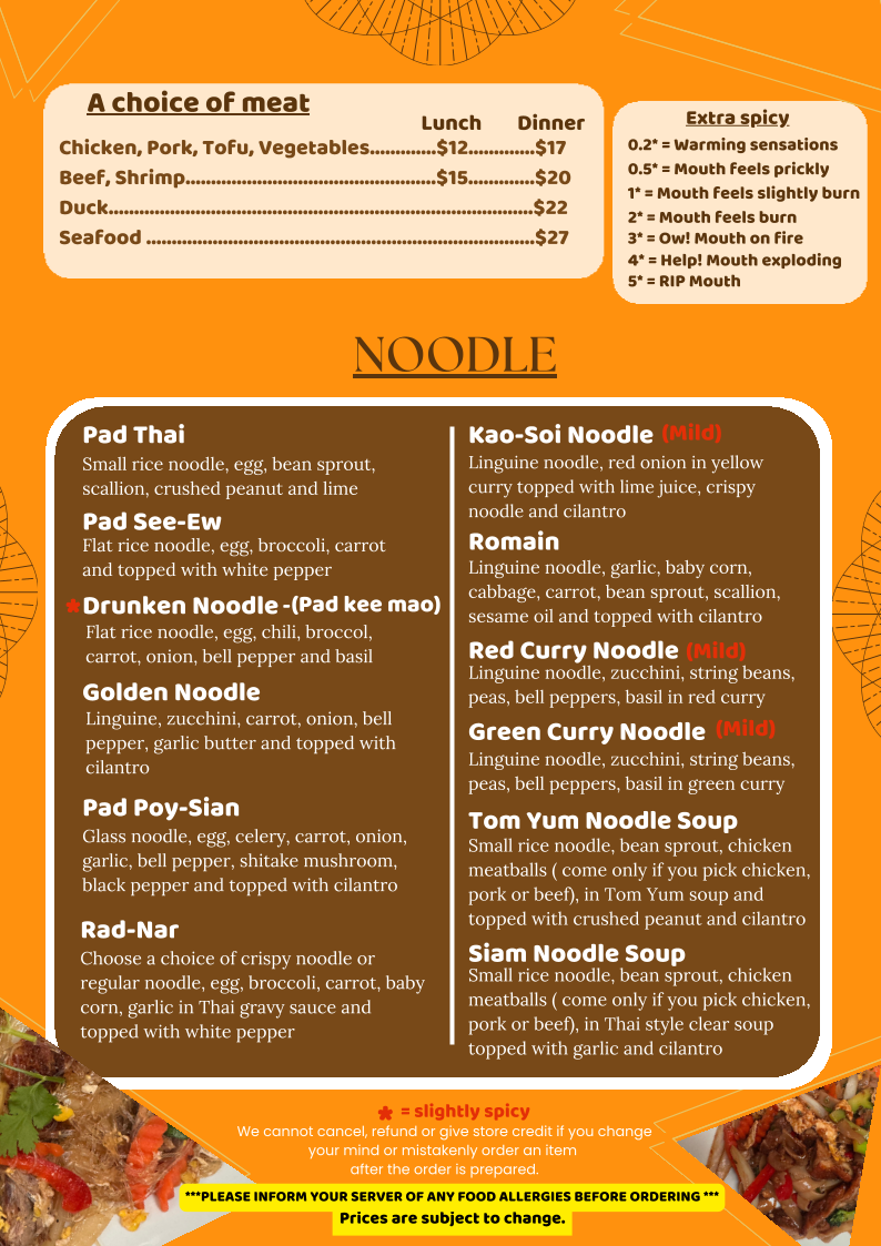 Small rice noodle, bean sprout, chicken meatballs ( come only if you pick chicken, pork or beef), in Thai style clear soup topped with garlic and cilantro